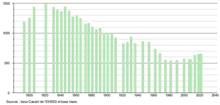 L'évolution du nombre d'habitants est connue à travers les recensements de la population effectués dans la commune depuis 1793. Pour les communes de moins de 10 000 habitants, une enquête de recensement portant sur toute la population est réalisée tous les cinq ans, les populations légales des années intermédiaires étant quant à elles estimées par interpolation ou extrapolation[23]. Pour la commune, le premier recensement exhaustif entrant dans le cadre du nouveau dispositif a été réalisé en 2008[24].