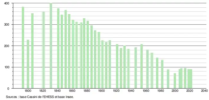 L'évolution du nombre d'habitants est connue à travers les recensements de la population effectués dans la commune depuis 1793. Pour les communes de moins de 10 000 habitants, une enquête de recensement portant sur toute la population est réalisée tous les cinq ans, les populations légales des années intermédiaires étant quant à elles estimées par interpolation ou extrapolation[26]. Pour la commune, le premier recensement exhaustif entrant dans le cadre du nouveau dispositif a été réalisé en 2008[27].
