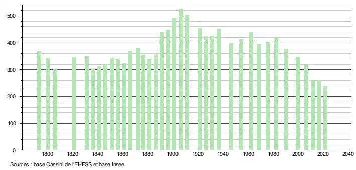 L'évolution du nombre d'habitants est connue à travers les recensements de la population effectués dans la commune depuis 1793. Pour les communes de moins de 10 000 habitants, une enquête de recensement portant sur toute la population est réalisée tous les cinq ans, les populations légales des années intermédiaires étant quant à elles estimées par interpolation ou extrapolation[28]. Pour la commune, le premier recensement exhaustif entrant dans le cadre du nouveau dispositif a été réalisé en 2006[29].
