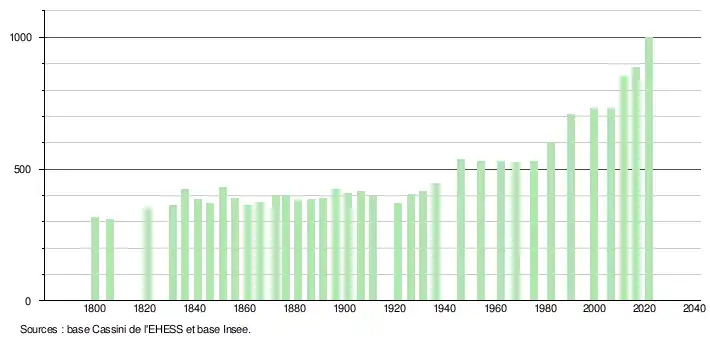 - Population municipale légale en vigueur au 1er janvier 2024, millésimée 2021, définie dans les limites territoriales en vigueur au 1er janvier 2023, date de référence statistique : 1er janvier 2021.