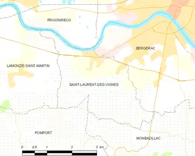 Saint-Laurent-des-Vignes est une commune rurale, car elle fait partie des communes peu ou très peu denses, au sens de la grille communale de densité de l'Insee[Note 4],[35],[36],[37]. Elle appartient à l'unité urbaine de Bergerac, une agglomération inter-départementale regroupant 22 communes[38] et 64 204 habitants en 2021, dont elle est une commune de la banlieue[39],[40].