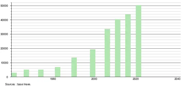 - Par convention dans Wikipédia, le principe a été retenu de n’afficher dans le tableau des recensements et le graphique, pour les populations légales postérieures à 1999, que les populations correspondant à une enquête exhaustive de recensement pour les communes de moins de 10 000 habitants, et que les populations des années 2006, 2011, 2016, etc. pour les communes de plus de 10 000 habitants, ainsi que la dernière population légale publiée par l’Insee pour l'ensemble des communes.