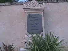 - À l'entrée du cimetière se trouve un pilier quadrangulaire portant des inscriptions latines. Il s'agit d'un cippe funéraire datant du IIe siècle. Plus massif qu'une stèle, il fait office de pierre tombale et d'autel. Des plantes occupent le creux aménagé dans la pierre pour recevoir les offrandes.