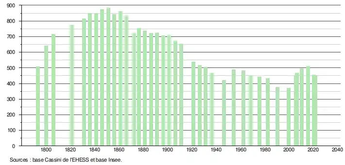 L'évolution du nombre d'habitants est connue à travers les recensements de la population effectués dans la commune depuis 1793. Pour les communes de moins de 10 000 habitants, une enquête de recensement portant sur toute la population est réalisée tous les cinq ans, les populations légales des années intermédiaires étant quant à elles estimées par interpolation ou extrapolation[17]. Pour la commune, le premier recensement exhaustif entrant dans le cadre du nouveau dispositif a été réalisé en 2005[18].