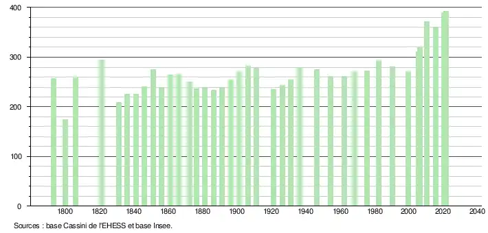 L'évolution du nombre d'habitants est connue à travers les recensements de la population effectués dans la commune depuis 1793. Pour les communes de moins de 10 000 habitants, une enquête de recensement portant sur toute la population est réalisée tous les cinq ans, les populations légales des années intermédiaires étant quant à elles estimées par interpolation ou extrapolation[18]. Pour la commune, le premier recensement exhaustif entrant dans le cadre du nouveau dispositif a été réalisé en 2005[19].