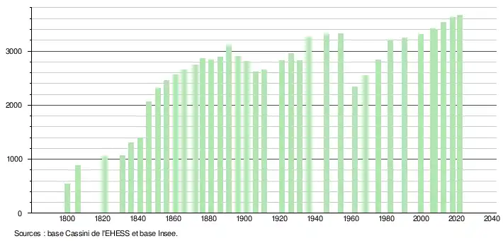 L'évolution du nombre d'habitants est connue à travers les recensements de la population effectués dans la commune depuis 1800. Pour les communes de moins de 10 000 habitants, une enquête de recensement portant sur toute la population est réalisée tous les cinq ans, les populations légales des années intermédiaires étant quant à elles estimées par interpolation ou extrapolation[26]. Pour la commune, le premier recensement exhaustif entrant dans le cadre du nouveau dispositif a été réalisé en 2007[27].