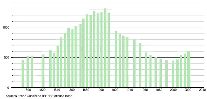 L'évolution du nombre d'habitants est connue à travers les recensements de la population effectués dans la commune depuis 1793. Pour les communes de moins de 10 000 habitants, une enquête de recensement portant sur toute la population est réalisée tous les cinq ans, les populations légales des années intermédiaires étant quant à elles estimées par interpolation ou extrapolation[28]. Pour la commune, le premier recensement exhaustif entrant dans le cadre du nouveau dispositif a été réalisé en 2005[29].