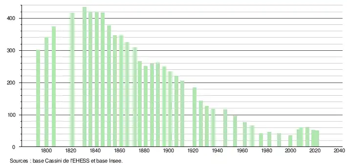 L'évolution du nombre d'habitants est connue à travers les recensements de la population effectués dans la commune depuis 1793. Pour les communes de moins de 10 000 habitants, une enquête de recensement portant sur toute la population est réalisée tous les cinq ans, les populations légales des années intermédiaires étant quant à elles estimées par interpolation ou extrapolation[30]. Pour la commune, le premier recensement exhaustif entrant dans le cadre du nouveau dispositif a été réalisé en 2008[31].