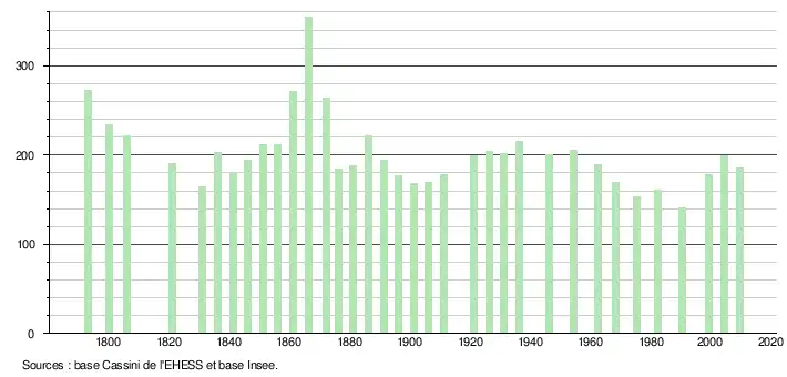 - Dans le tableau des recensements et le graphique, par convention dans Wikipédia, le principe a été retenu, pour les populations légales postérieures à 1999 de n’afficher dans le tableau des recensements et le graphique que les populations correspondant à l'année 2006, première population légale publiée calculée conformément aux concepts définis dans le décret no 2003-485 du 5 juin 2003, et les années correspondant à une enquête exhaustive de recensement pour les communes de moins de 10 000 habitants, ainsi que la dernière population légale publiée par l’Insee.
