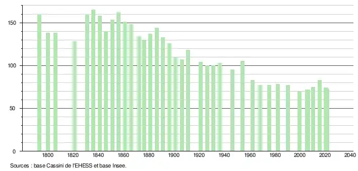 L'évolution du nombre d'habitants est connue à travers les recensements de la population effectués dans la commune depuis 1793. Pour les communes de moins de 10 000 habitants, une enquête de recensement portant sur toute la population est réalisée tous les cinq ans, les populations légales des années intermédiaires étant quant à elles estimées par interpolation ou extrapolation[19]. Pour la commune, le premier recensement exhaustif entrant dans le cadre du nouveau dispositif a été réalisé en 2005[20].