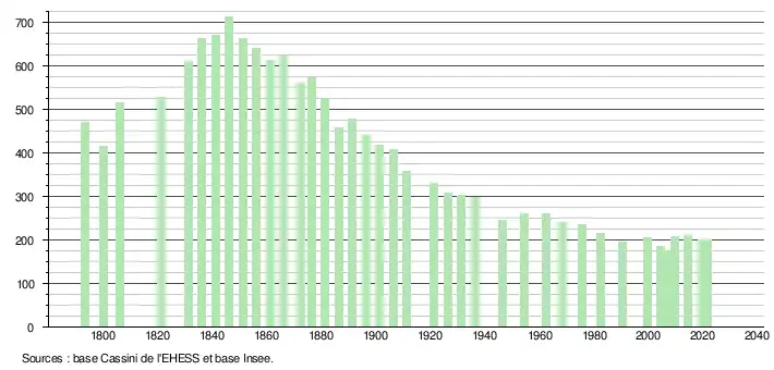 L'évolution du nombre d'habitants est connue à travers les recensements de la population effectués dans la commune depuis 1793. Pour les communes de moins de 10 000 habitants, une enquête de recensement portant sur toute la population est réalisée tous les cinq ans, les populations légales des années intermédiaires étant quant à elles estimées par interpolation ou extrapolation[37]. Pour la commune, le premier recensement exhaustif entrant dans le cadre du nouveau dispositif a été réalisé en 2004[38].