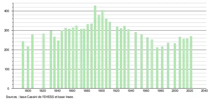 L'évolution du nombre d'habitants est connue à travers les recensements de la population effectués dans la commune depuis 1793. Pour les communes de moins de 10 000 habitants, une enquête de recensement portant sur toute la population est réalisée tous les cinq ans, les populations légales des années intermédiaires étant quant à elles estimées par interpolation ou extrapolation[19]. Pour la commune, le premier recensement exhaustif entrant dans le cadre du nouveau dispositif a été réalisé en 2006[20].