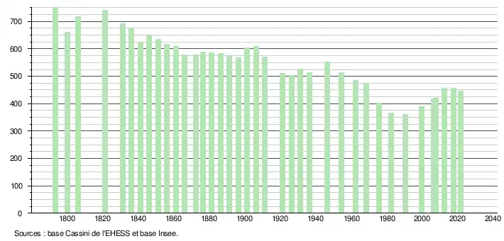 L'évolution du nombre d'habitants est connue à travers les recensements de la population effectués dans la commune depuis 1793. Pour les communes de moins de 10 000 habitants, une enquête de recensement portant sur toute la population est réalisée tous les cinq ans, les populations légales des années intermédiaires étant quant à elles estimées par interpolation ou extrapolation[23]. Pour la commune, le premier recensement exhaustif entrant dans le cadre du nouveau dispositif a été réalisé en 2007[24].
