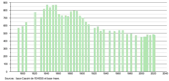 L'évolution du nombre d'habitants est connue à travers les recensements de la population effectués dans la commune depuis 1793. Pour les communes de moins de 10 000 habitants, une enquête de recensement portant sur toute la population est réalisée tous les cinq ans, les populations légales des années intermédiaires étant quant à elles estimées par interpolation ou extrapolation[28]. Pour la commune, le premier recensement exhaustif entrant dans le cadre du nouveau dispositif a été réalisé en 2004[29].