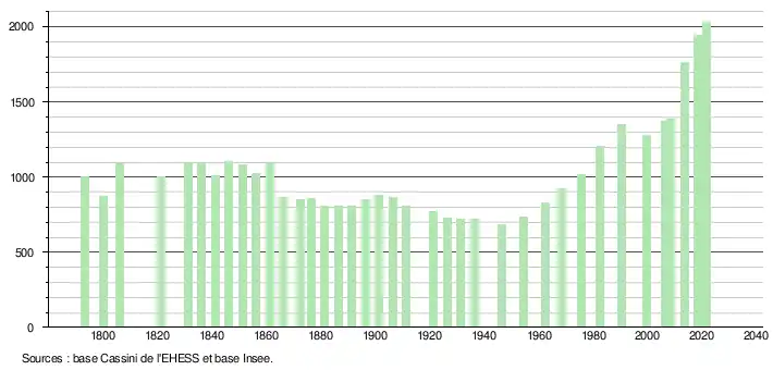 L'évolution du nombre d'habitants est connue à travers les recensements de la population effectués dans la commune depuis 1793. Pour les communes de moins de 10 000 habitants, une enquête de recensement portant sur toute la population est réalisée tous les cinq ans, les populations légales des années intermédiaires étant quant à elles estimées par interpolation ou extrapolation[28]. Pour la commune, le premier recensement exhaustif entrant dans le cadre du nouveau dispositif a été réalisé en 2008[29].
