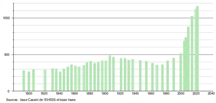 L'évolution du nombre d'habitants est connue à travers les recensements de la population effectués dans la commune depuis 1793. Pour les communes de moins de 10 000 habitants, une enquête de recensement portant sur toute la population est réalisée tous les cinq ans, les populations légales des années intermédiaires étant quant à elles estimées par interpolation ou extrapolation[17]. Pour la commune, le premier recensement exhaustif entrant dans le cadre du nouveau dispositif a été réalisé en 2004[18].