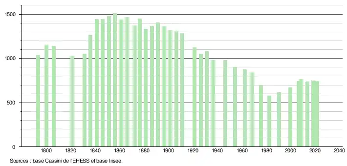 L'évolution du nombre d'habitants est connue à travers les recensements de la population effectués dans la commune depuis 1793. Pour les communes de moins de 10 000 habitants, une enquête de recensement portant sur toute la population est réalisée tous les cinq ans, les populations légales des années intermédiaires étant quant à elles estimées par interpolation ou extrapolation[19]. Pour la commune, le premier recensement exhaustif entrant dans le cadre du nouveau dispositif a été réalisé en 2008[20].