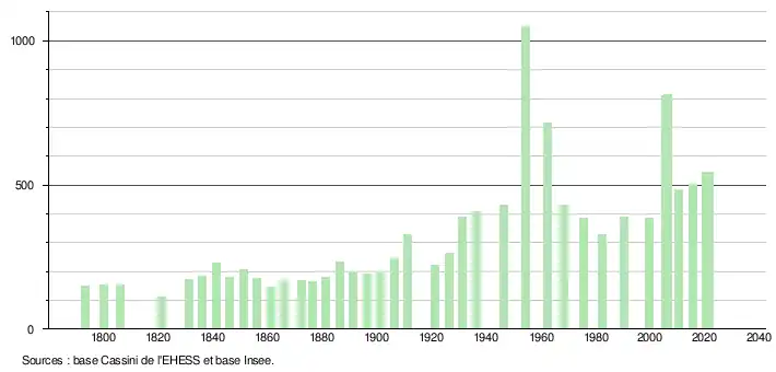 L'évolution du nombre d'habitants est connue à travers les recensements de la population effectués dans la commune depuis 1793. Pour les communes de moins de 10 000 habitants, une enquête de recensement portant sur toute la population est réalisée tous les cinq ans, les populations légales des années intermédiaires étant quant à elles estimées par interpolation ou extrapolation[21]. Pour la commune, le premier recensement exhaustif entrant dans le cadre du nouveau dispositif a été réalisé en 2005[22].