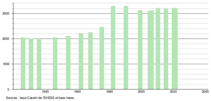 L'évolution du nombre d'habitants est connue à travers les recensements de la population effectués dans la commune depuis 1926. Pour les communes de moins de 10 000 habitants, une enquête de recensement portant sur toute la population est réalisée tous les cinq ans, les populations légales des années intermédiaires étant quant à elles estimées par interpolation ou extrapolation[24]. Pour la commune, le premier recensement exhaustif entrant dans le cadre du nouveau dispositif a été réalisé en 2005[25].