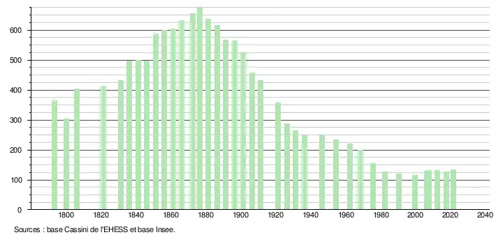 L'évolution du nombre d'habitants est connue à travers les recensements de la population effectués dans la commune depuis 1793. Pour les communes de moins de 10 000 habitants, une enquête de recensement portant sur toute la population est réalisée tous les cinq ans, les populations légales des années intermédiaires étant quant à elles estimées par interpolation ou extrapolation[22]. Pour la commune, le premier recensement exhaustif entrant dans le cadre du nouveau dispositif a été réalisé en 2007[23].
