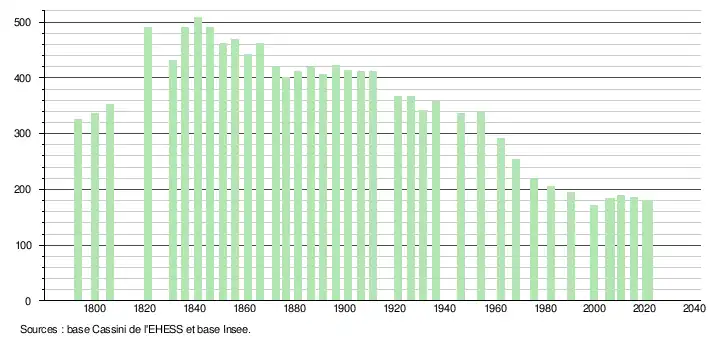 L'évolution du nombre d'habitants est connue à travers les recensements de la population effectués dans la commune depuis 1793. Pour les communes de moins de 10 000 habitants, une enquête de recensement portant sur toute la population est réalisée tous les cinq ans, les populations légales des années intermédiaires étant quant à elles estimées par interpolation ou extrapolation[64]. Pour la commune, le premier recensement exhaustif entrant dans le cadre du nouveau dispositif a été réalisé en 2005[65].