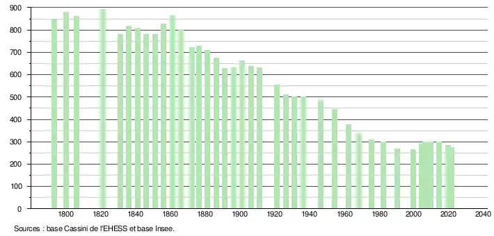 L'évolution du nombre d'habitants est connue à travers les recensements de la population effectués dans la commune depuis 1793. Pour les communes de moins de 10 000 habitants, une enquête de recensement portant sur toute la population est réalisée tous les cinq ans, les populations légales des années intermédiaires étant quant à elles estimées par interpolation ou extrapolation[13]. Pour la commune, le premier recensement exhaustif entrant dans le cadre du nouveau dispositif a été réalisé en 2004[14].