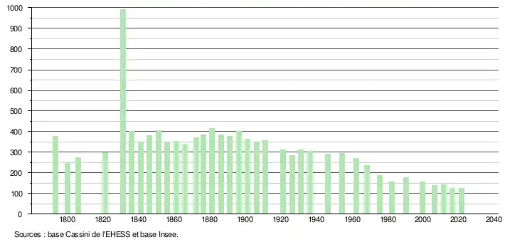 L'évolution du nombre d'habitants est connue à travers les recensements de la population effectués dans la commune depuis 1793. Pour les communes de moins de 10 000 habitants, une enquête de recensement portant sur toute la population est réalisée tous les cinq ans, les populations légales des années intermédiaires étant quant à elles estimées par interpolation ou extrapolation[19]. Pour la commune, le premier recensement exhaustif entrant dans le cadre du nouveau dispositif a été réalisé en 2006[20].