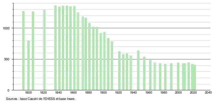 L'évolution du nombre d'habitants est connue à travers les recensements de la population effectués dans la commune depuis 1793. Pour les communes de moins de 10 000 habitants, une enquête de recensement portant sur toute la population est réalisée tous les cinq ans, les populations légales des années intermédiaires étant quant à elles estimées par interpolation ou extrapolation[22]. Pour la commune, le premier recensement exhaustif entrant dans le cadre du nouveau dispositif a été réalisé en 2008[23].