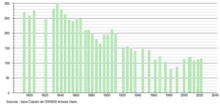 L'évolution du nombre d'habitants est connue à travers les recensements de la population effectués dans la commune depuis 1793. Pour les communes de moins de 10 000 habitants, une enquête de recensement portant sur toute la population est réalisée tous les cinq ans, les populations légales des années intermédiaires étant quant à elles estimées par interpolation ou extrapolation[20]. Pour la commune, le premier recensement exhaustif entrant dans le cadre du nouveau dispositif a été réalisé en 2007[21].