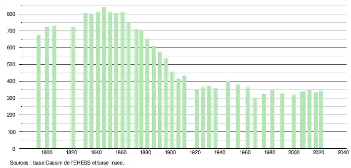 L'évolution du nombre d'habitants est connue à travers les recensements de la population effectués dans la commune depuis 1793. Pour les communes de moins de 10 000 habitants, une enquête de recensement portant sur toute la population est réalisée tous les cinq ans, les populations légales des années intermédiaires étant quant à elles estimées par interpolation ou extrapolation[27]. Pour la commune, le premier recensement exhaustif entrant dans le cadre du nouveau dispositif a été réalisé en 2007[28].