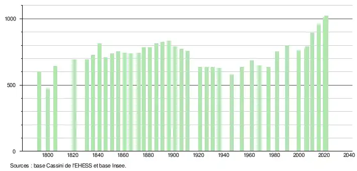 L'évolution du nombre d'habitants est connue à travers les recensements de la population effectués dans la commune depuis 1793. Pour les communes de moins de 10 000 habitants, une enquête de recensement portant sur toute la population est réalisée tous les cinq ans, les populations légales des années intermédiaires étant quant à elles estimées par interpolation ou extrapolation[19]. Pour la commune, le premier recensement exhaustif entrant dans le cadre du nouveau dispositif a été réalisé en 2005[20].