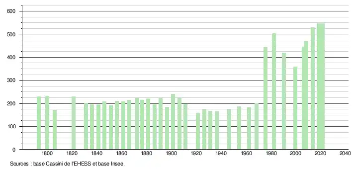 L'évolution du nombre d'habitants est connue à travers les recensements de la population effectués dans la commune depuis 1793. Pour les communes de moins de 10 000 habitants, une enquête de recensement portant sur toute la population est réalisée tous les cinq ans, les populations légales des années intermédiaires étant quant à elles estimées par interpolation ou extrapolation[19]. Pour la commune, le premier recensement exhaustif entrant dans le cadre du nouveau dispositif a été réalisé en 2008[20].