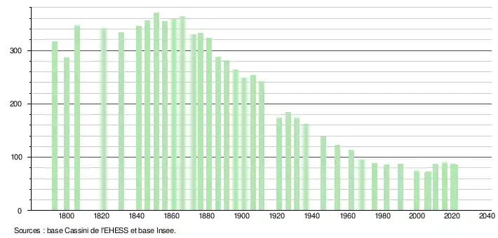| L'évolution du nombre d'habitants est connue à travers les recensements de la population effectués dans la commune depuis 1793. Pour les communes de moins de 10 000 habitants, une enquête de recensement portant sur toute la population est réalisée tous les cinq ans, les populations légales des années intermédiaires étant quant à elles estimées par interpolation ou extrapolation[22]. Pour la commune, le premier recensement exhaustif entrant dans le cadre du nouveau dispositif a été réalisé en 2005[23]. En 2021, la commune comptait 86 habitants[Note 3], en diminution de 4,44 % par rapport à 2015 (Gers : +0,79 %, France hors Mayotte : +1,84 %). |