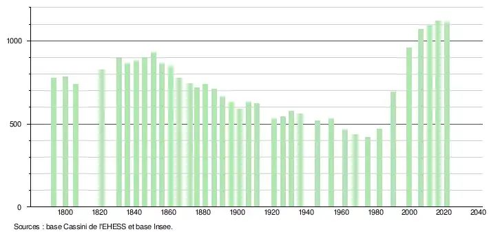 | L'évolution du nombre d'habitants est connue à travers les recensements de la population effectués dans la commune depuis 1793. Pour les communes de moins de 10 000 habitants, une enquête de recensement portant sur toute la population est réalisée tous les cinq ans, les populations légales des années intermédiaires étant quant à elles estimées par interpolation ou extrapolation[26]. Pour la commune, le premier recensement exhaustif entrant dans le cadre du nouveau dispositif a été réalisé en 2006[27]. En 2021, la commune comptait 1 113 habitants[Note 3], en diminution de 0,27 % par rapport à 2015 (Aude : +2,47 %, France hors Mayotte : +1,84 %). |