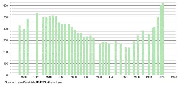 | L'évolution du nombre d'habitants est connue à travers les recensements de la population effectués dans la commune depuis 1793. Pour les communes de moins de 10 000 habitants, une enquête de recensement portant sur toute la population est réalisée tous les cinq ans, les populations légales des années intermédiaires étant quant à elles estimées par interpolation ou extrapolation[34]. Pour la commune, le premier recensement exhaustif entrant dans le cadre du nouveau dispositif a été réalisé en 2008[35]. En 2021, la commune comptait 624 habitants[Note 5], en augmentation de 14,5 % par rapport à 2015 (Lot-et-Garonne : −0,66 %, France hors Mayotte : +1,84 %). |