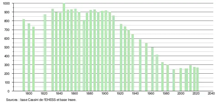 L'évolution du nombre d'habitants est connue à travers les recensements de la population effectués dans la commune depuis 1793. Pour les communes de moins de 10 000 habitants, une enquête de recensement portant sur toute la population est réalisée tous les cinq ans, les populations légales des années intermédiaires étant quant à elles estimées par interpolation ou extrapolation[23]. Pour la commune, le premier recensement exhaustif entrant dans le cadre du nouveau dispositif a été réalisé en 2007[24].