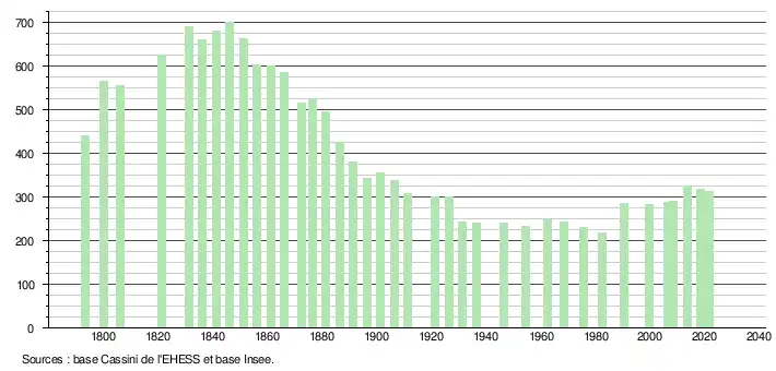 L'évolution du nombre d'habitants est connue à travers les recensements de la population effectués dans la commune depuis 1793. Pour les communes de moins de 10 000 habitants, une enquête de recensement portant sur toute la population est réalisée tous les cinq ans, les populations légales des années intermédiaires étant quant à elles estimées par interpolation ou extrapolation[30]. Pour la commune, le premier recensement exhaustif entrant dans le cadre du nouveau dispositif a été réalisé en 2008[31].