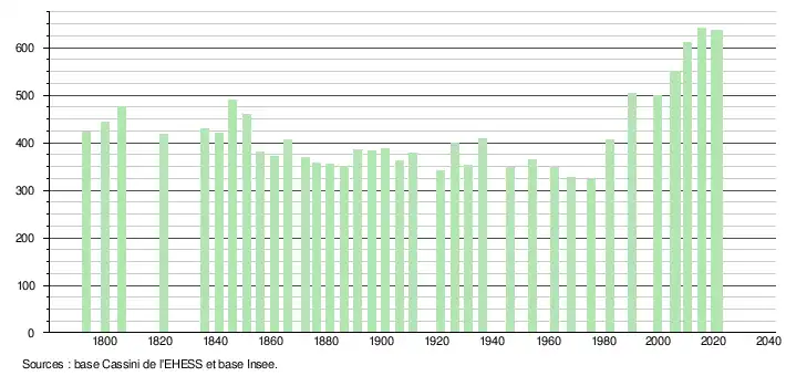 L'évolution du nombre d'habitants est connue à travers les recensements de la population effectués dans la commune depuis 1793. Pour les communes de moins de 10 000 habitants, une enquête de recensement portant sur toute la population est réalisée tous les cinq ans, les populations légales des années intermédiaires étant quant à elles estimées par interpolation ou extrapolation[25]. Pour la commune, le premier recensement exhaustif entrant dans le cadre du nouveau dispositif a été réalisé en 2005[26].