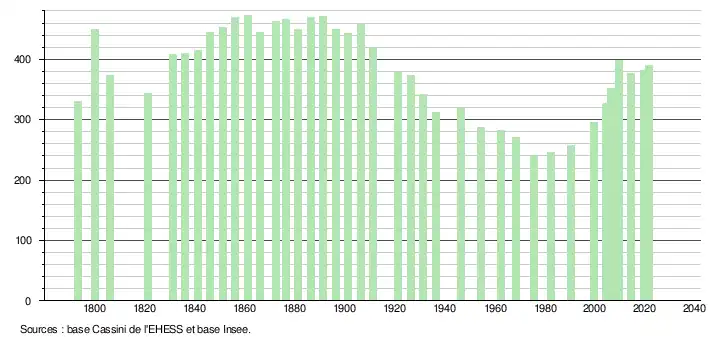 L'évolution du nombre d'habitants est connue à travers les recensements de la population effectués dans la commune depuis 1793. Pour les communes de moins de 10 000 habitants, une enquête de recensement portant sur toute la population est réalisée tous les cinq ans, les populations légales des années intermédiaires étant quant à elles estimées par interpolation ou extrapolation[15]. Pour la commune, le premier recensement exhaustif entrant dans le cadre du nouveau dispositif a été réalisé en 2004[16].