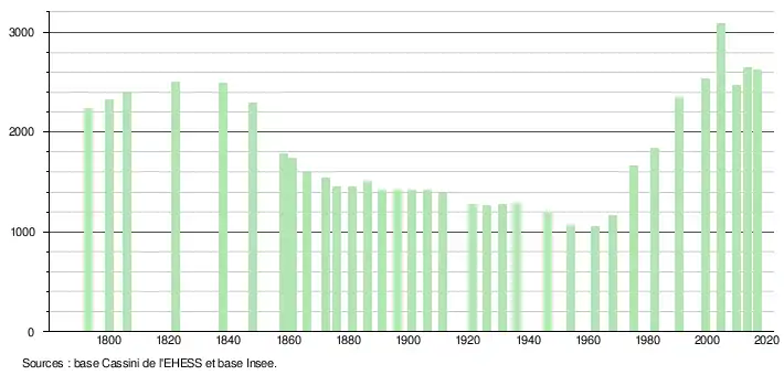 L'évolution du nombre d'habitants est connue à travers les recensements de la population effectués dans la commune depuis 1793. À partir du , les populations légales des communes sont publiées annuellement dans le cadre d'un recensement qui repose désormais sur une collecte d'information annuelle, concernant successivement tous les territoires communaux au cours d'une période de cinq ans. Pour les communes de moins de 10 000 habitants, une enquête de recensement portant sur toute la population est réalisée tous les cinq ans, les populations légales des années intermédiaires étant quant à elles estimées par interpolation ou extrapolation[13]. Pour la commune, le premier recensement exhaustif entrant dans le cadre du nouveau dispositif a été réalisé en 2004[14],[Note 2].