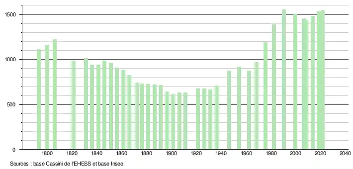 L'évolution du nombre d'habitants est connue à travers les recensements de la population effectués dans la commune depuis 1793. Pour les communes de moins de 10 000 habitants, une enquête de recensement portant sur toute la population est réalisée tous les cinq ans, les populations légales des années intermédiaires étant quant à elles estimées par interpolation ou extrapolation[32]. Pour la commune, le premier recensement exhaustif entrant dans le cadre du nouveau dispositif a été réalisé en 2008[33].