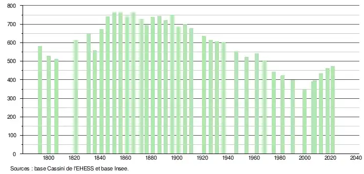 L'évolution du nombre d'habitants est connue à travers les recensements de la population effectués dans la commune depuis 1793. Pour les communes de moins de 10 000 habitants, une enquête de recensement portant sur toute la population est réalisée tous les cinq ans, les populations légales des années intermédiaires étant quant à elles estimées par interpolation ou extrapolation[21]. Pour la commune, le premier recensement exhaustif entrant dans le cadre du nouveau dispositif a été réalisé en 2007[22].
