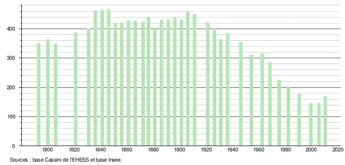 L'évolution du nombre d'habitants est connue à travers les recensements de la population effectués dans la commune depuis 1793. À partir du , les populations légales des communes sont publiées annuellement dans le cadre d'un recensement qui repose désormais sur une collecte d'information annuelle, concernant successivement tous les territoires communaux au cours d'une période de cinq ans. Pour les communes de moins de 10 000 habitants, une enquête de recensement portant sur toute la population est réalisée tous les cinq ans, les populations légales des années intermédiaires étant quant à elles estimées par interpolation ou extrapolation[11]. Pour la commune, le premier recensement exhaustif entrant dans le cadre du nouveau dispositif a été réalisé en 2005[12],[Note 1].