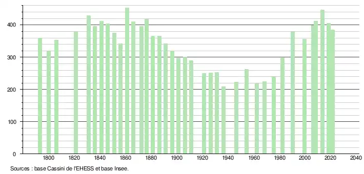 L'évolution du nombre d'habitants est connue à travers les recensements de la population effectués dans la commune depuis 1793. Pour les communes de moins de 10 000 habitants, une enquête de recensement portant sur toute la population est réalisée tous les cinq ans, les populations légales des années intermédiaires étant quant à elles estimées par interpolation ou extrapolation[22]. Pour la commune, le premier recensement exhaustif entrant dans le cadre du nouveau dispositif a été réalisé en 2008[23].
