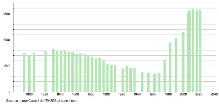 L'évolution du nombre d'habitants est connue à travers les recensements de la population effectués dans la commune depuis 1793. Pour les communes de moins de 10 000 habitants, une enquête de recensement portant sur toute la population est réalisée tous les cinq ans, les populations légales des années intermédiaires étant quant à elles estimées par interpolation ou extrapolation[21]. Pour la commune, le premier recensement exhaustif entrant dans le cadre du nouveau dispositif a été réalisé en 2007[22].