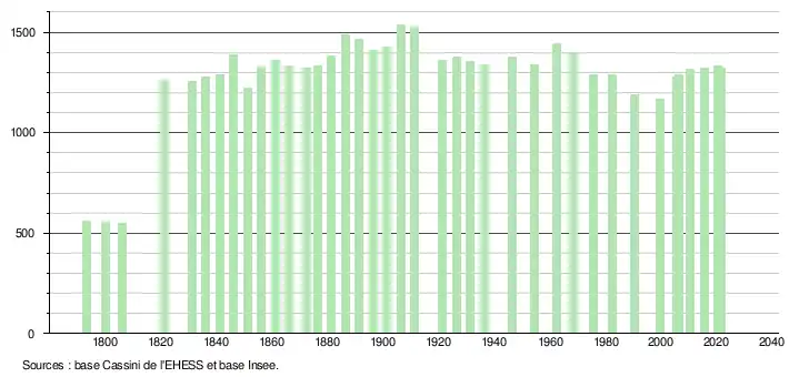 L'évolution du nombre d'habitants est connue à travers les recensements de la population effectués dans la commune depuis 1793. Pour les communes de moins de 10 000 habitants, une enquête de recensement portant sur toute la population est réalisée tous les cinq ans, les populations légales des années intermédiaires étant quant à elles estimées par interpolation ou extrapolation[30]. Pour la commune, le premier recensement exhaustif entrant dans le cadre du nouveau dispositif a été réalisé en 2005[31].
