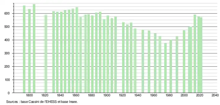 L'évolution du nombre d'habitants est connue à travers les recensements de la population effectués dans la commune depuis 1793. Pour les communes de moins de 10 000 habitants, une enquête de recensement portant sur toute la population est réalisée tous les cinq ans, les populations légales des années intermédiaires étant quant à elles estimées par interpolation ou extrapolation[28]. Pour la commune, le premier recensement exhaustif entrant dans le cadre du nouveau dispositif a été réalisé en 2008[29].