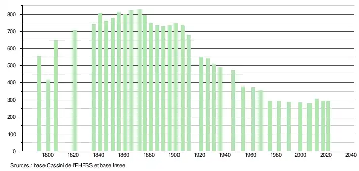 L'évolution du nombre d'habitants est connue à travers les recensements de la population effectués dans la commune depuis 1793. Pour les communes de moins de 10 000 habitants, une enquête de recensement portant sur toute la population est réalisée tous les cinq ans, les populations légales des années intermédiaires étant quant à elles estimées par interpolation ou extrapolation[15]. Pour la commune, le premier recensement exhaustif entrant dans le cadre du nouveau dispositif a été réalisé en 2007[16].