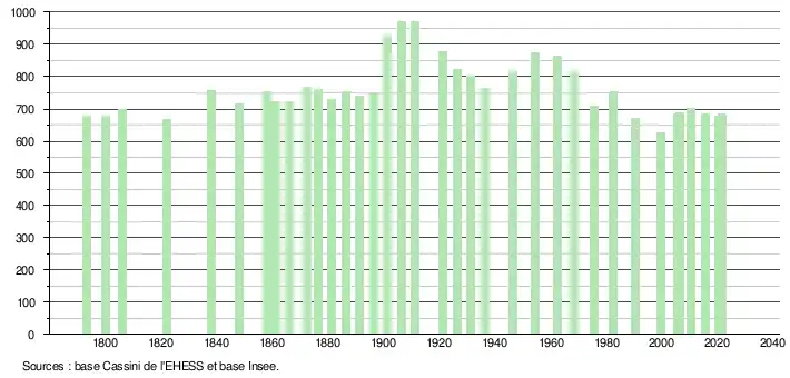 L'évolution du nombre d'habitants est connue à travers les recensements de la population effectués dans la commune depuis 1793. Pour les communes de moins de 10 000 habitants, une enquête de recensement portant sur toute la population est réalisée tous les cinq ans, les populations légales des années intermédiaires étant quant à elles estimées par interpolation ou extrapolation[13]. Pour la commune, le premier recensement exhaustif entrant dans le cadre du nouveau dispositif a été réalisé en 2005[14].