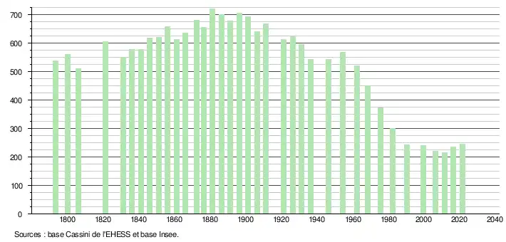 L'évolution du nombre d'habitants est connue à travers les recensements de la population effectués dans la commune depuis 1793. Pour les communes de moins de 10 000 habitants, une enquête de recensement portant sur toute la population est réalisée tous les cinq ans, les populations légales des années intermédiaires étant quant à elles estimées par interpolation ou extrapolation[21]. Pour la commune, le premier recensement exhaustif entrant dans le cadre du nouveau dispositif a été réalisé en 2006[22].